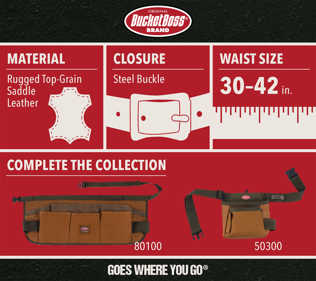 The Leather Tool Belt - 30 in. to 42 in. is for professional contractor use. Sized to fit 30 in. to 42 in. waists, it features a 2 in. steel roller buckle for easy adjustment. Fits all standard tool pouches and accessories.