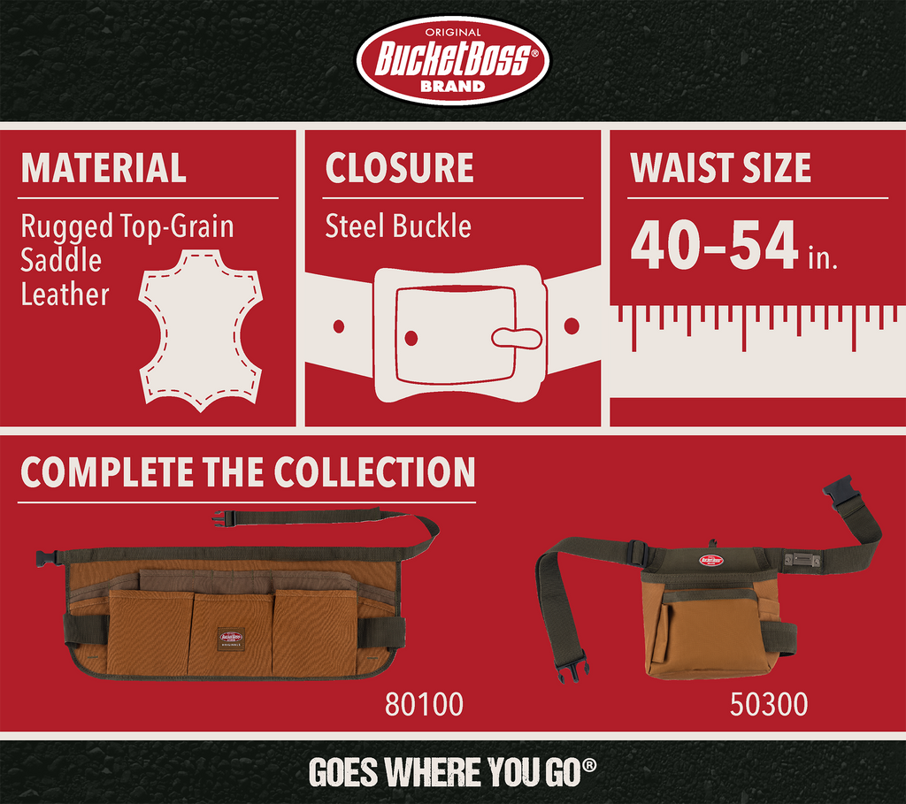 The Leather Tool Belt - 40 in. to 54 in. is for professional contractor use. Sized to fit 40 in. to 54 in. waists, it features a 2 in. steel roller buckle for easy adjustment. Fits all standard tool pouches and accessories. The leather keeper holds unused belt length and the plated buckle protects from rust.