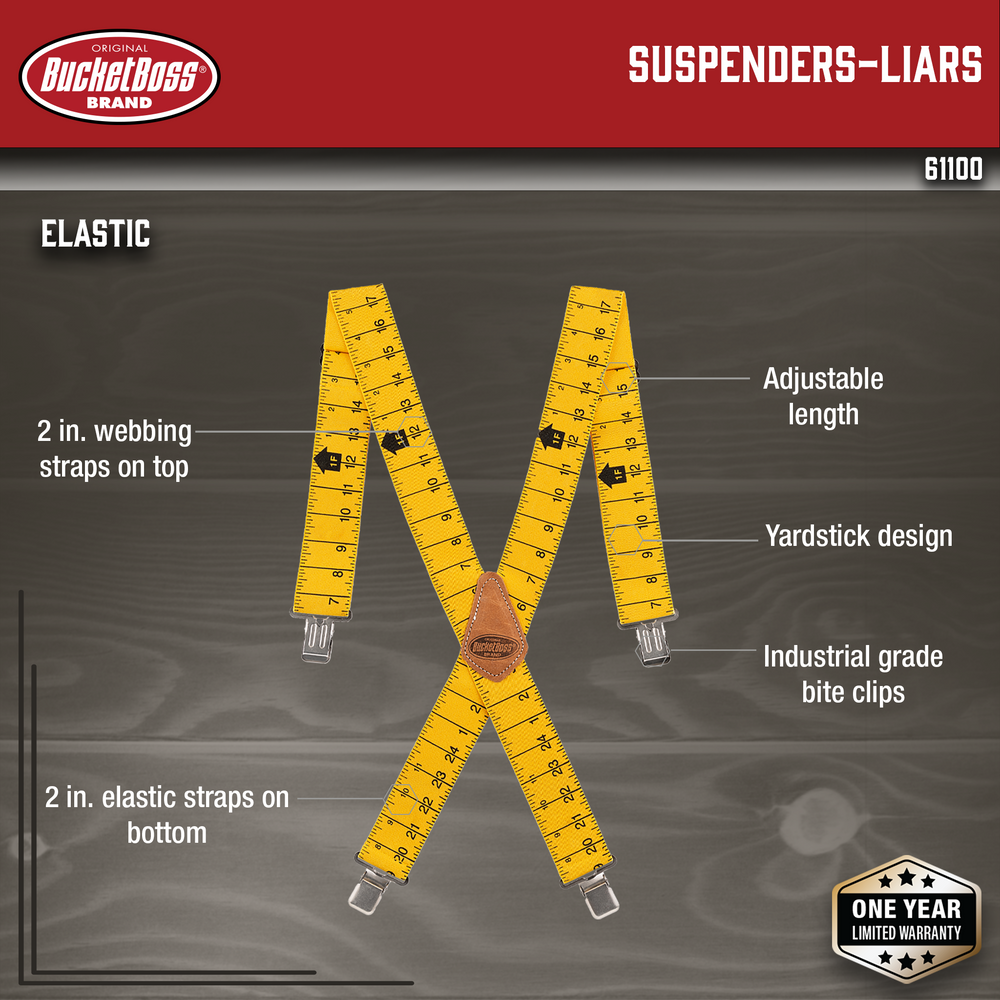The aptly named Liars Suspenders feature elastic printed straps in a yardstick design that will stretch to show just about any measurement! Quality is no joke though, featuring industrial grade bite clips and hardware. Straps are made from 2-inch thick elastic on the bottom for added flexibility. Suspenders are constructed with 2-inch webbing at the top and can be fully adjusted with metal sliders to accommodate most heights. The straps are joined in the center by a genuine leather patch.