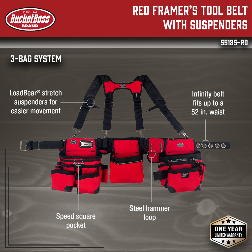Not all tool belts are the same. The 55185 series rigs are made from an industry-leading two-ply, 1680 denier heavyweight poly fabric for lasting durability. LoadBear stretch suspension technology allows the weight of the tool belt to move comfortably with your body while at work. Suspenders have moisture-wicking padding and feature a chest-retaining strap as well as a stretching cell phone pocket that will fit any smartphone south of a tablet. Dedicated speed square pocket is where it should be, along with three back wall tool slots where they should be. Pouches and suspenders can be removed or adjusted to your own liking. Barrel-bottom pouches allow for extra carrying capacity, reinforced with double layers at corner stress points of course. Additional features include one steel hammer holder in back, and an additional web loop for hammers on the pouch, cats-paw sleeves, and a tape measure clip. Infinity belt can be adjusted up to a 52 in. waist by adjusting the metal slider and the heavy-duty steel grommets.