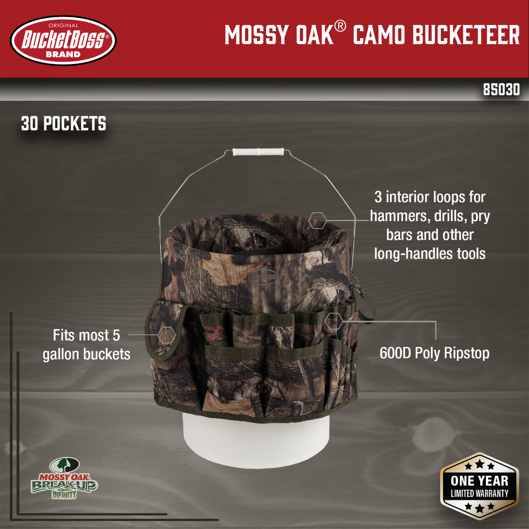 The Mossy Oak® Camo Bucketeer is a revolutionary tool storage organizer, only made from Mossy Oak® Break-Up Infinity Camo fabric. Designed to fit any 5 gal. bucket, the Mossy Oak® Camo Bucketeer delivers instant organization with 30 pockets for tools and three interior loops for hammers and pry bars, all while keeping the bucket center open for bulk storage. Made of durable, water-resistant 600 denier poly ripstop fabric that will last for years, the Mossy Oak® Camo Bucketeer is a mobile, tool-organizing machine.