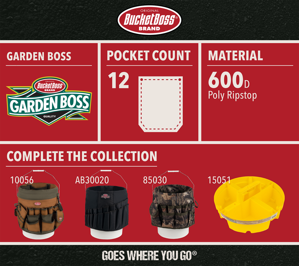 The Garden Boss bucket tool organizer is another innovation from Bucket Boss, the inventor of the bucket tool organizer and is designed to store gardening supplies. This 5 gal. bucket organizer is perfect for gardening tool storage and organization, and is made with 600 poly ripstop fabric. Featuring a unique design that is ideal for gardening storage, the Garden Boss has custom pockets to hold long trowels and spades, and three pockets dedicated for seed pouches. An exterior clip is included for holding gloves. The Garden Boss attaches to the outside of your bucket to keep the center open for other supplies. This gardening tool storage bucket organizer will fit on most 5 gal. buckets (bucket not included).