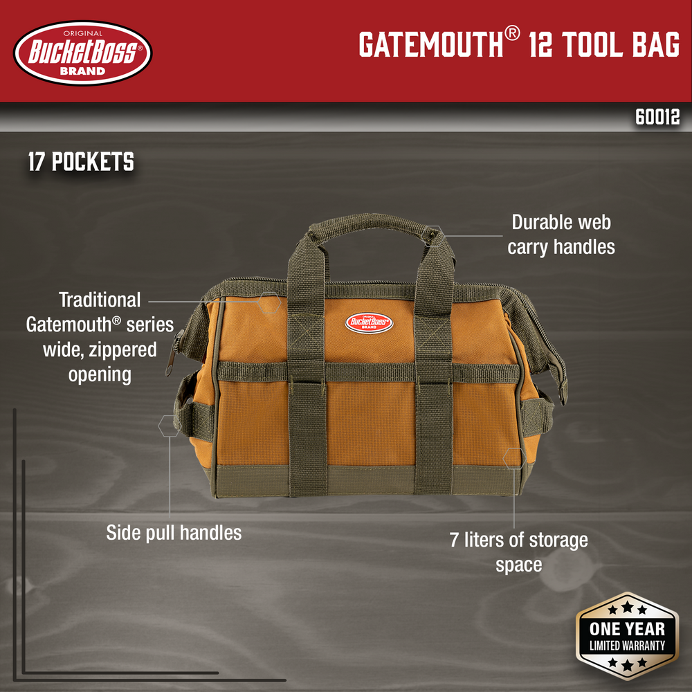 The Gatemouth 12 Tool Bag is ideal for the DIYer and is perfect for holding small hand tools. Constructed with durable poly ripstop/600 denier poly material, this is the bag with the super-wide “doctor’s bag” opening. There are 17 total pockets to hold tools or other items in place. The bottom of the bag is reinforced with padded webbing ripstop material. There are now side pull handles so you can pull your bag across a surface. The carrying handle makes it easy to transport your tools while on the job. The Gatemouth 12 Tool Bag also features oversized industrial zippers great for carrying drills, small tools and more.