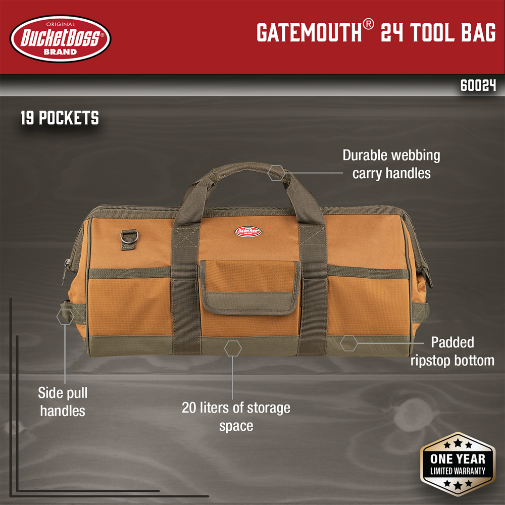 From the Bucket Boss Gatemouth series, the Gatemouth 24 Tool Bag is constructed with double-wall 600 denier poly ripstop water-resistant fabric. Equipped with the traditional zippered Gatemouth opening, the bag maintains its shape while open, making it easy to locate contents inside. This tool bag features the traditional wide mouth “doctor’s bag” opening, and also includes: 19 pockets, durable webbing carry handles, oversized industrial zippers, side pull handles, heavy-duty binding, and a padded bottom that is reinforced with webbing straps. A detachable, adjustable, padded shoulder strap can be adjusted for a customized fit. The Gatemouth 24 Tool Bag was originally designed to hold a 2 ft. level and reciprocating saw, but has found numerous other applications due to its thin, low-profile design. The 19 pockets on this tool bag hold tools or other items in place. The bottom of the bag is reinforced with padded ripstop material. There are now side pull handles so you can pull your bag across a surface.