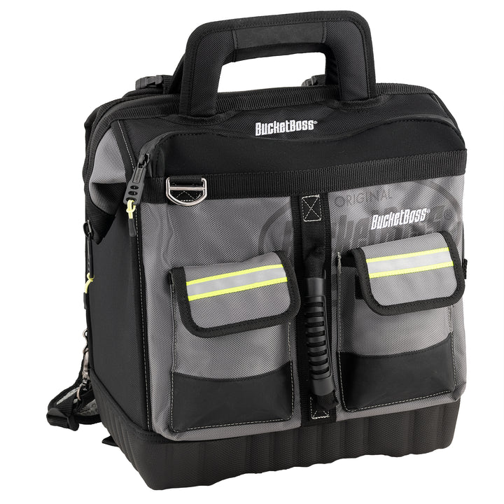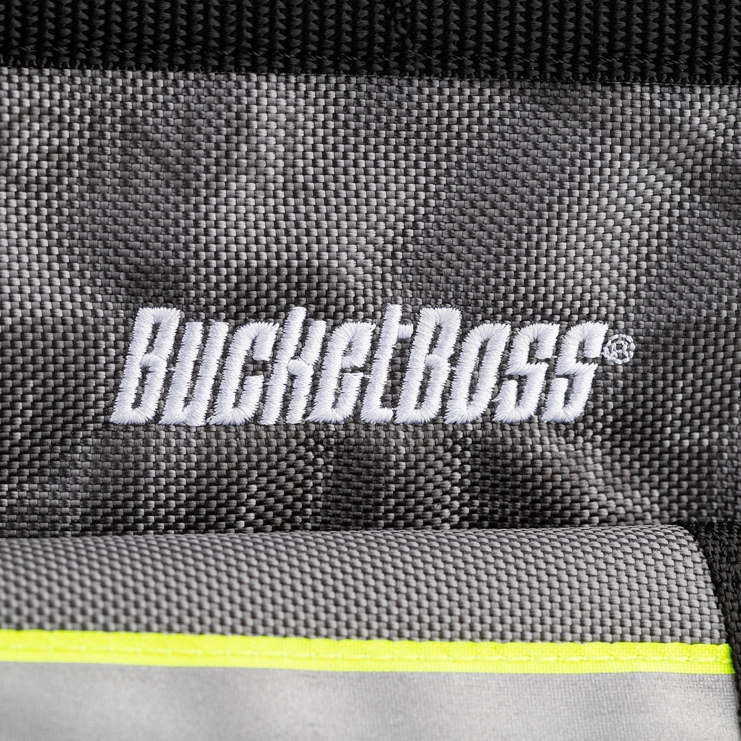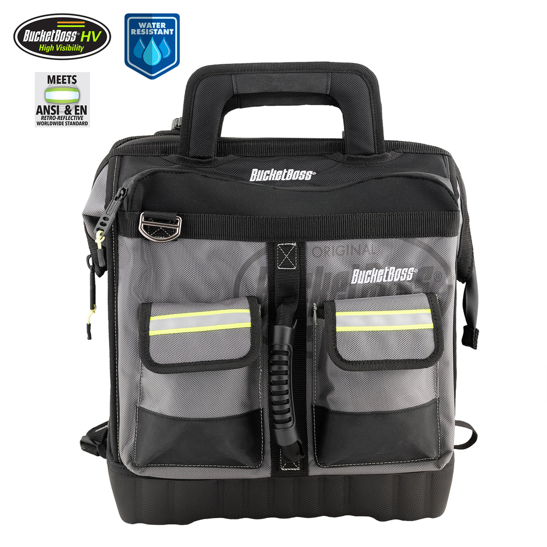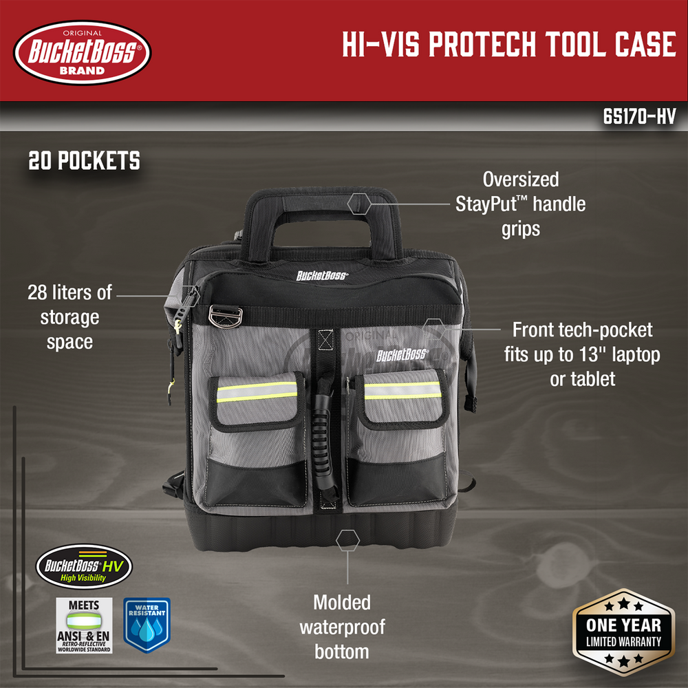 From the Bucket Boss Professional High-Visibility series, the Hi-Vis ProTech Tool Case has 23 total pockets and is built more like a case than a bag, hence the name. Equipped with 3M™ Scotchlite™ Reflective that meets ANSI and EN1150 Retro-Reflective worldwide standards for high-visibility and job site safety. Made for the professional, this tool bag is constructed with heavyweight 1680 two-ply poly fabric and boasts a molded waterproof bottom to protect bag contents. This tool bag also features oversized StayPut handle grips that remain in an upright position, but also an innovative removable, adjustable strap system allowing the tool bag to be worn as a backpack, or tucked behind a cushioned back panel, or be removed altogether. D-Rings allow shoulder strap (not included) to be easily attached to the tool bag case. The front-molded grip allows the tool bag to be repositioned easily while sitting upright, allowing the case to be used on a bench as a workstation. The zippered tech pocket is lined with thick, flexible neoprene and holds up to a 13 in. laptop or tablet. Other features of this high visibility professional tool bag case include a waterproof zipper to keep its 28 L capacity dry, and 20 total tool pockets.