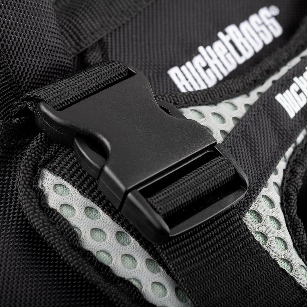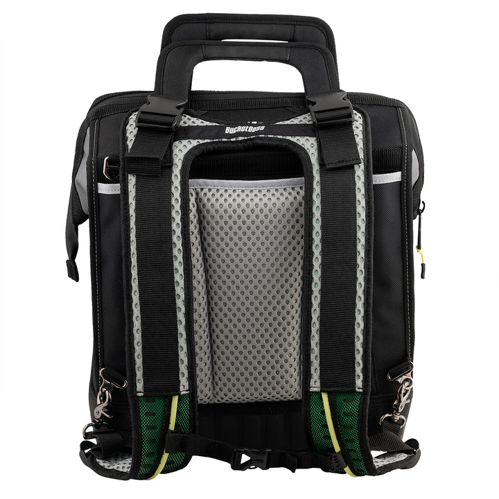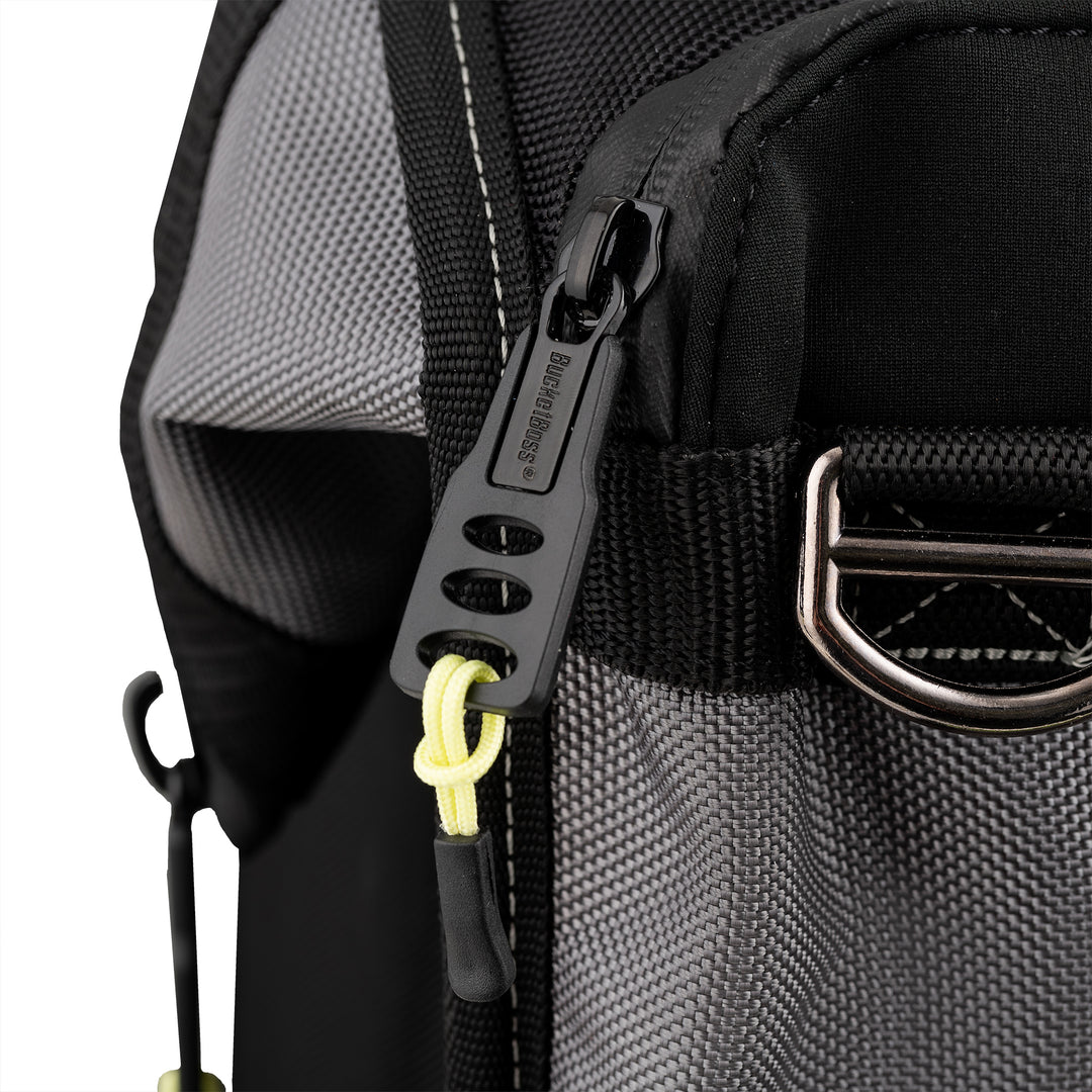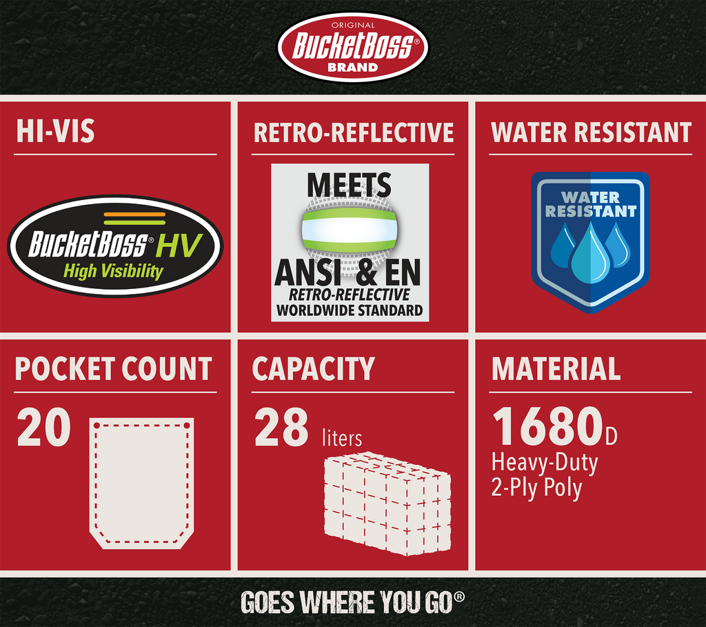 From the Bucket Boss Professional High-Visibility series, the Hi-Vis ProTech Tool Case has 23 total pockets and is built more like a case than a bag, hence the name. Equipped with 3M™ Scotchlite™ Reflective that meets ANSI and EN1150 Retro-Reflective worldwide standards for high-visibility and job site safety. Made for the professional, this tool bag is constructed with heavyweight 1680 two-ply poly fabric and boasts a molded waterproof bottom to protect bag contents. This tool bag also features oversized StayPut handle grips that remain in an upright position, but also an innovative removable, adjustable strap system allowing the tool bag to be worn as a backpack, or tucked behind a cushioned back panel, or be removed altogether. D-Rings allow shoulder strap (not included) to be easily attached to the tool bag case. The front-molded grip allows the tool bag to be repositioned easily while sitting upright, allowing the case to be used on a bench as a workstation. The zippered tech pocket is lined with thick, flexible neoprene and holds up to a 13 in. laptop or tablet. Other features of this high visibility professional tool bag case include a waterproof zipper to keep its 28 L capacity dry, and 20 total tool pockets.
