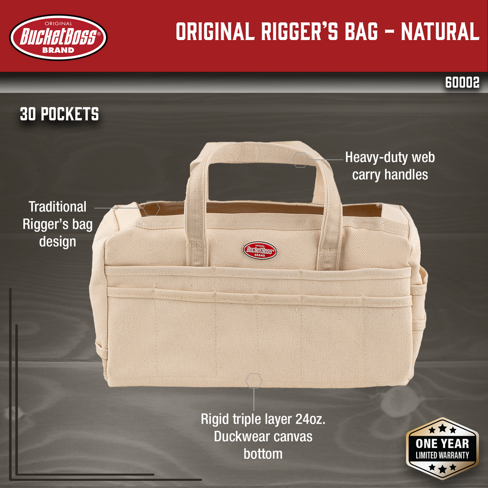 A Bucket Boss Original, introduced in 1991, the Original Rigger’s Bag - Natural is inspired by the open top totes used on sailing vessels literally for centuries. Made from an incredibly heavy-duty 24 oz. rigid canvas that is lined with a waterproof coating and triple-layered on the bottom, the Original Rigger's Bag - Natural boasts exceptional strength and durability. With the main compartment open for tools, the bag’s exterior features 30 pockets for organized storage and strong web carry handles. Imitations are everywhere, so don’t be fooled—buy the real deal.