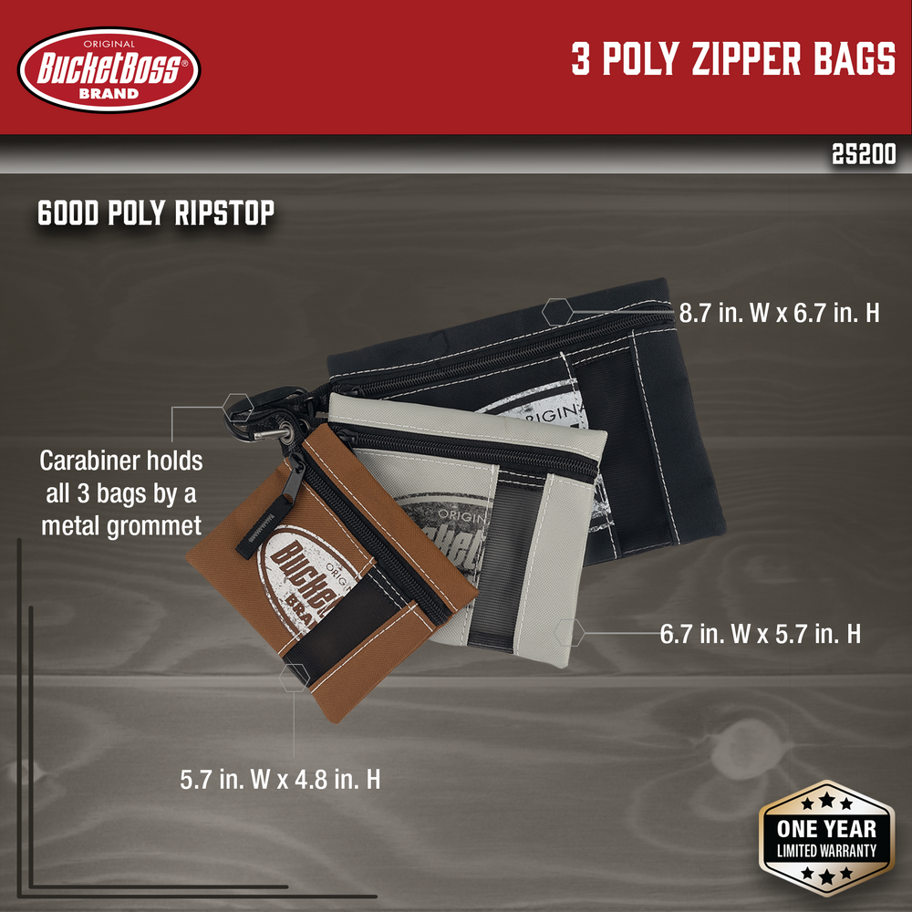 The 3 Poly Zipper Bags are designed to organize small parts and tools. In three assorted sizes and colors, each bag has a mesh window to view contents, and has a sturdy zipper with an easy pull tab. The bags also feature a metal grommet and can all be held together by a carabiner (included).