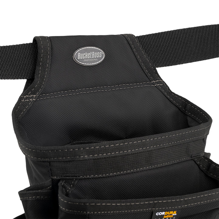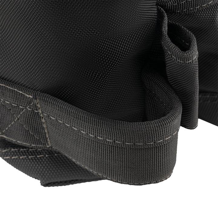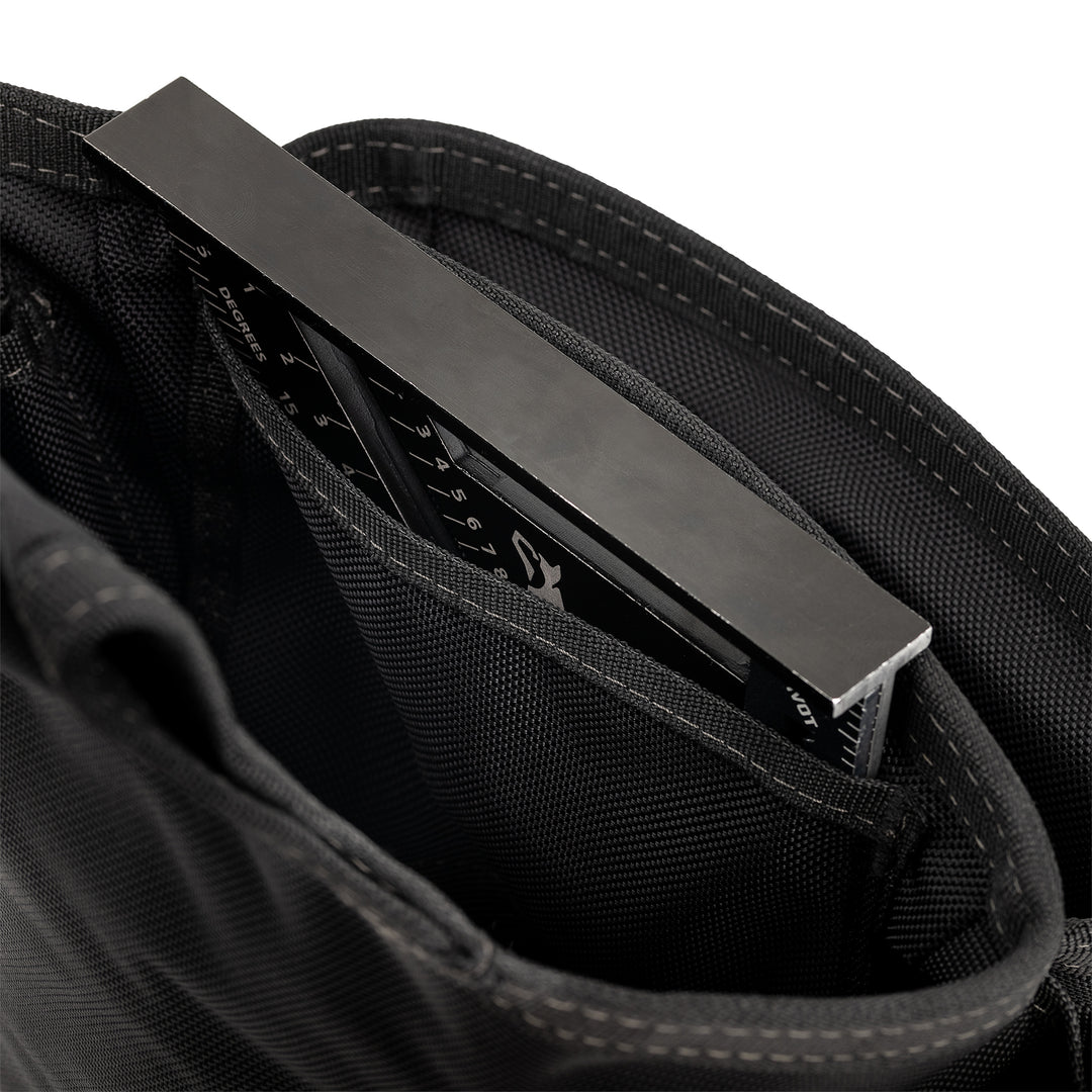 The Ballistic Carpenter’s Pouch is made from ballistic nylon, the longest-lasting material on the planet for tool bags, and reinforced with double-fabric layers on the bottom for extra durability. Barrel-bottom, reinforced pouch creates extra carrying capacity, and features a designated speed square pocket, and a heavy-duty web loop for hammers. Features 11 total pockets, including an open-end nail puller sleeve, three back wall vertical tool slots, and a truly massive front pouch.