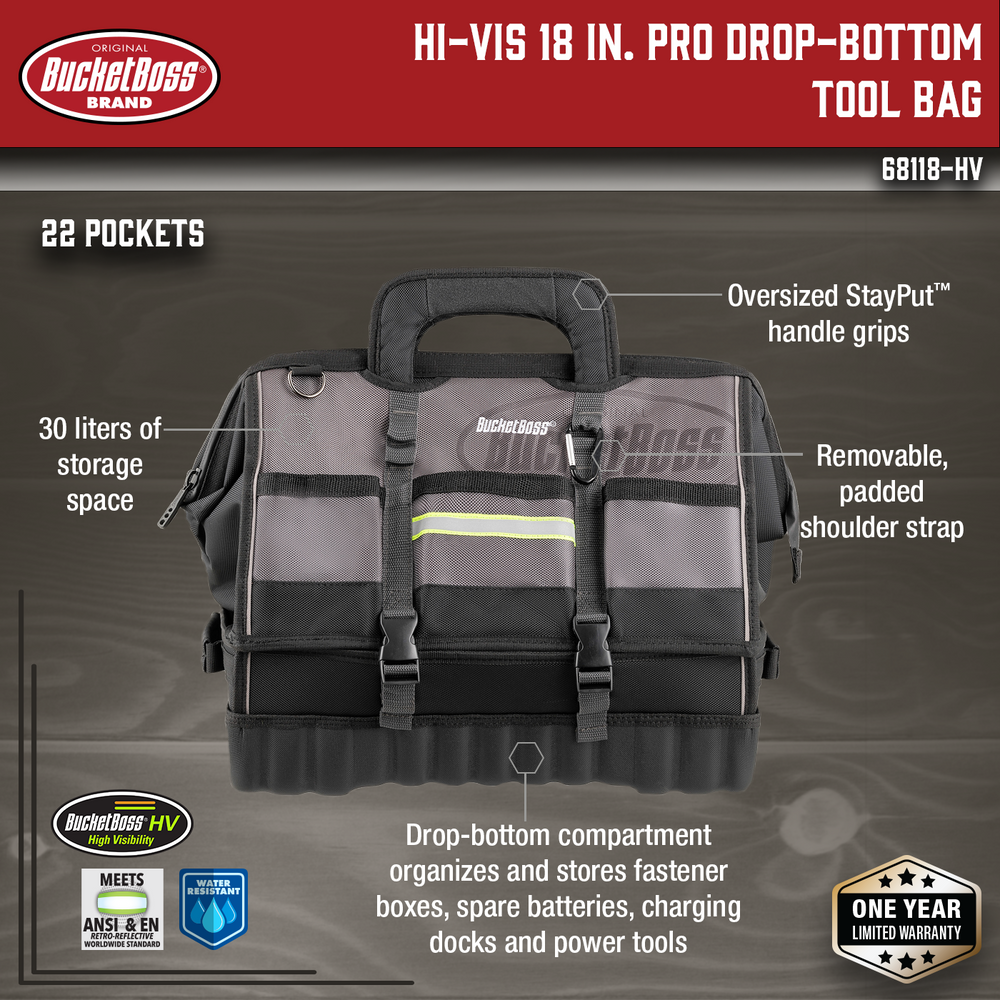 From the Bucket Boss High-Visibility series, the Hi-Vis 18" Pro Drop-Bottom Tool Bag is equipped with 3M™ Scotchlite™ Reflective that meets ANSI and EN1150 Retro-Reflective worldwide standards for high-visibility and jobsite safety. The revolutionary Hi-Vis 18" Pro Drop-Bottom Tool Bag features a complete drop-bottom compartment, with adjustable dividers for secure storage. Made for the professional, and constructed with heavyweight 1680 two-ply poly fabric, this bag boasts a molded waterproof bottom to protect bag contents. The drop-bottom compartment is secured with a double-buckle closure and zipper, and comes with adjustable dividers to hold spare batteries, accessories, and fastener boxes. Other features include a waterproof zipper to keep contents dry, StayPut handle grips that remain in an upright position, 22 total pockets, and pull handles on both ends of the bag. A detachable padded shoulder strap can be adjusted for a customized fit.