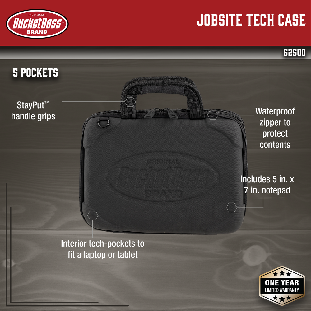 The Jobsite Tech Case is constructed with molded rubber and EVA foam. Equipped with a fully zippered main compartment, this case is designed to efficiently store technology on the jobsite. Dedicated tech pockets in the interior can store a tablet or laptop. Other features include: five pockets, StayPut handles and a rear pocket for file storage. The case comes with a 5 in. x 7 in. notepad.