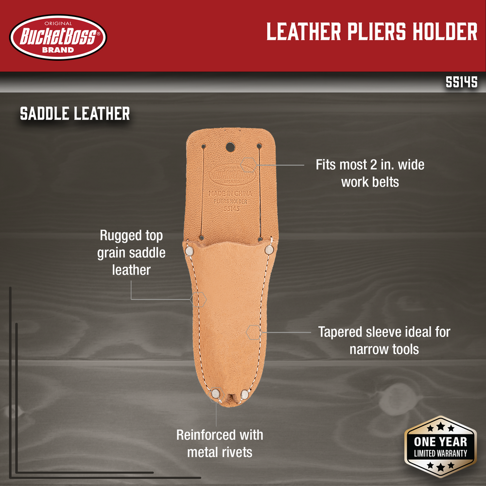 The Leather Pliers Holder is made from rugged top-grain saddle leather and constructed with metal rivets for more durability. This holder is made for holding narrow pliers in place and right at hand with its tapered sleeve. It will also fit on most 2 in. work belts so you don’t need to buy a special size belt to accommodate it. Pair this with the Saddle Leather Belt.