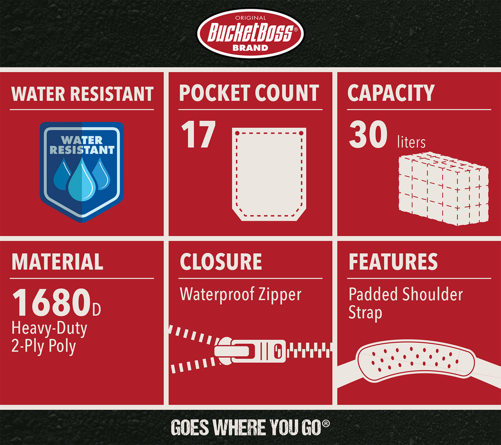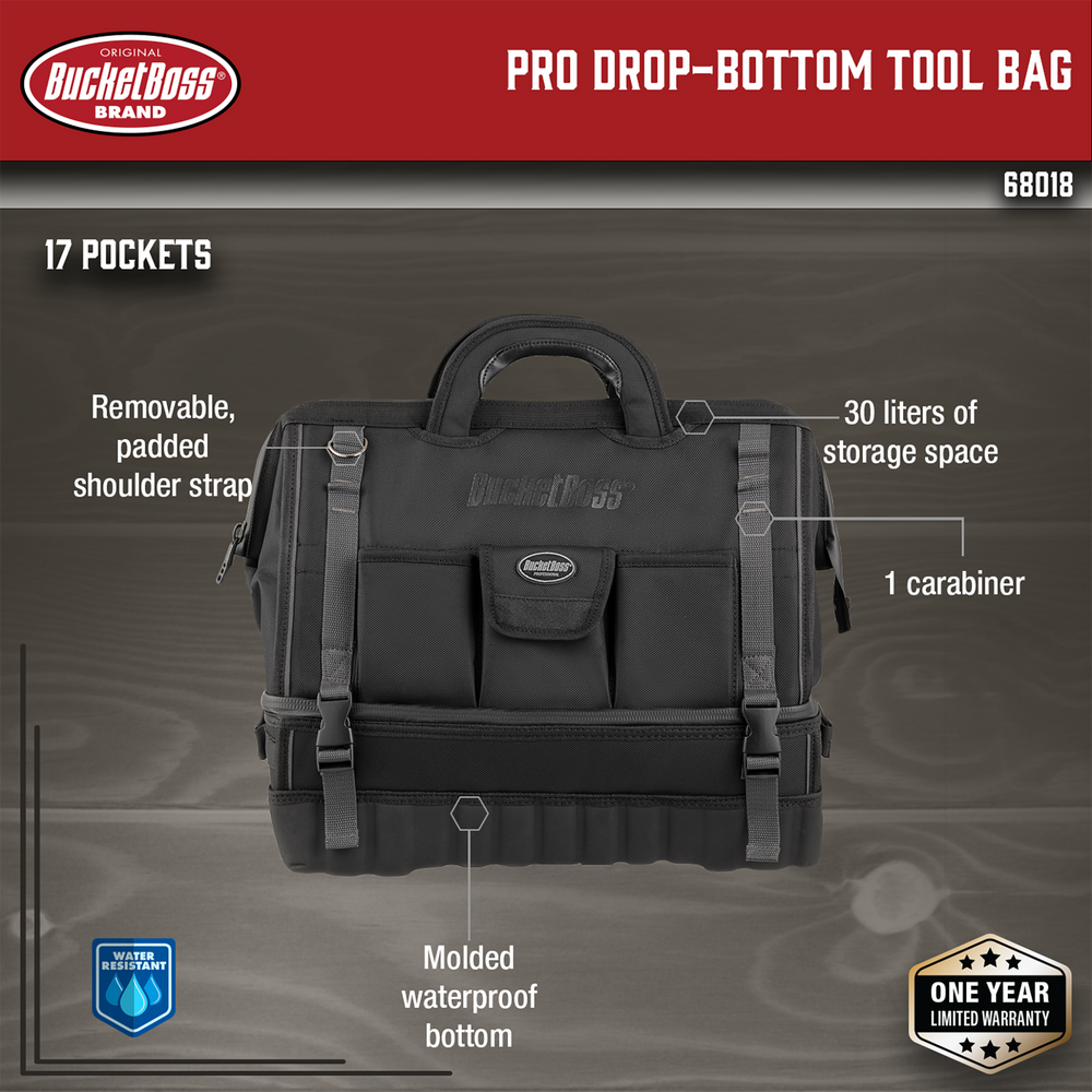From the Bucket Boss Professional Series, the Pro Drop-Bottom Tool Bag is made for the professional, constructed with heavyweight 1680 two-ply poly fabric and boasts a molded, waterproof bottom to protect bag contents. The drop-bottom compartment is secured with a double-buckle closure and zipper, and comes with adjustable dividers to hold spare batteries, accessories, and fastener boxes. Other features include: a waterproof zipper to keep contents dry, StayPut handle grips that remain in an upright position, 17 pockets and pull handles on both ends of the bag. A detachable, padded shoulder strap can be adjusted for a customized fit.