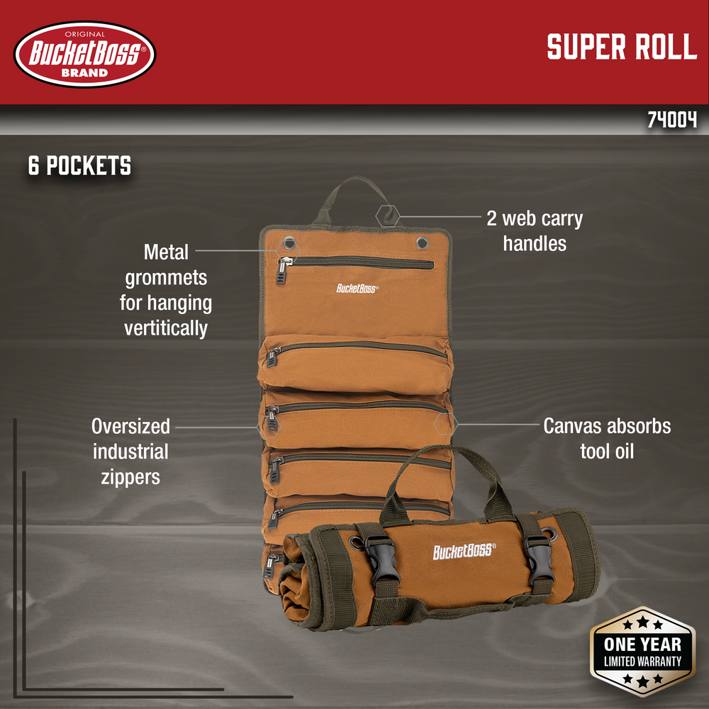 Made from heavy-duty Duckwear canvas, the Super Roll is ideal for storing and organizing tools while absorbing excess oil. Featuring six assorted pockets packed into a compact roll, the Super Roll can be rolled and secured with a dual-buckle system and carried with durable web handles. Five pleated pouches offer a unique storage solution for small parts or fasteners and can be closed with oversized industrial zippers. The Super Roll can be used while laying flat or hung vertically by using its two metal grommets.