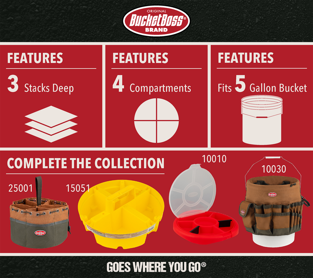 “Bucket” is in our name. We work hard to be the “Boss” of tool organization. In 1987, we innovated a new tool organizer—the Original Bucket Boss. Today, our robust Bucket Organizers collection keeps the spirit of our brand strong. Rethink your five-gallon bucket with Bucket Boss, and see how we stack up.