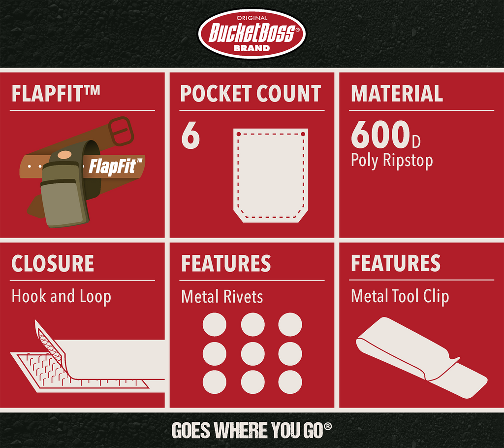 Bucket Boss has the perfect small tool pouch for the DIYer. The Tool Pouch with Flap Fit has nine pockets and eight tool loops. The Tool Pouch with FlapFit fits inside your pants pocket or over a belt so you now have two ways to carry the Tool Pouch. Made of poly ripstop/600D poly material, this pouch has a tape clip holder and web loop to hold keys and a tool snap.