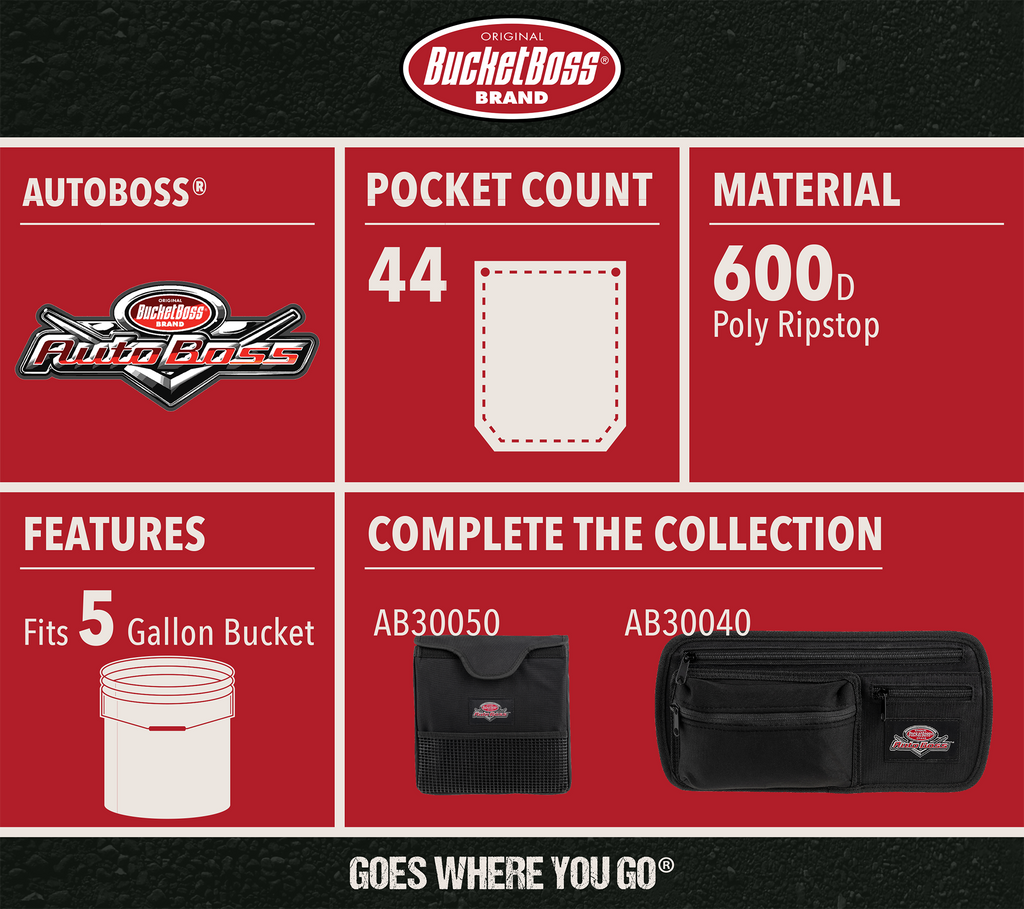 The Auto Boss Wrench Boss is another innovation from Bucket Boss, the inventor of the bucket tool organizer. The Wrench Boss keeps your wrenches organized, visible and at-the-ready on any 5 gal. bucket. This tool storage bag is made of durable, water-resistant 600 denier poly ripstop fabric that will last for years. Features 44 escalating pockets to hold two 1/4 in. to 1 in. wrench sets. Equipped with eight interior pockets, leaving the center of the bucket open for bulk storage.